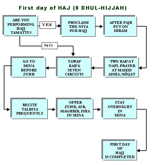 A pilgrim performing Hajj AlTamatt'u should intend Ihram, from the place where he is staying, on the 8th day of Thul-Hijjah, which is the Tarwiah Day, and leave to Mina in the morning. In Mina, the pilgrims pray Dhuhr, Asr, Maghrib and Isha of the 8th day of ThulHijjah and Fajr of the 9th day of ThulHijjah. Dhuhr, Asr and Isha are each shortened to two Rak'ah only, but are not combined. The pilgrim remains in Mina until sunrise of the 9th day of ThulHijjah and then leaves to Arafat.
