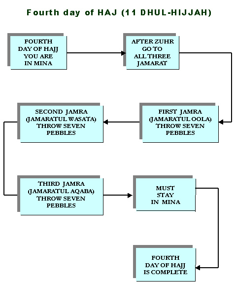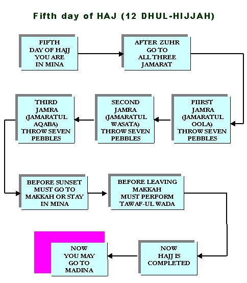 The pilgrim should return to Mina and spend there the days of Tashreeq (i.e. the I I th, 1 2th and 1 3th day of Thul-Hijjah). l During each day, and after Dhuhr prayer, | the pilgrim stones the three stone pillars called "Jamarat": The small, the medium and Jamrat Al-Aqabah, glorifying Allah "Allah-u Akbar" with each throw of the seven pebbles stoned at each pillar. These pebbles are picked up in Mina. A l Pilgrim may leave Mina to Makkah on the 13th of Thul-Hijjah or on the 12th if he wishes, there is no blame on him if he chooses the later, but he has to leave before sunset.